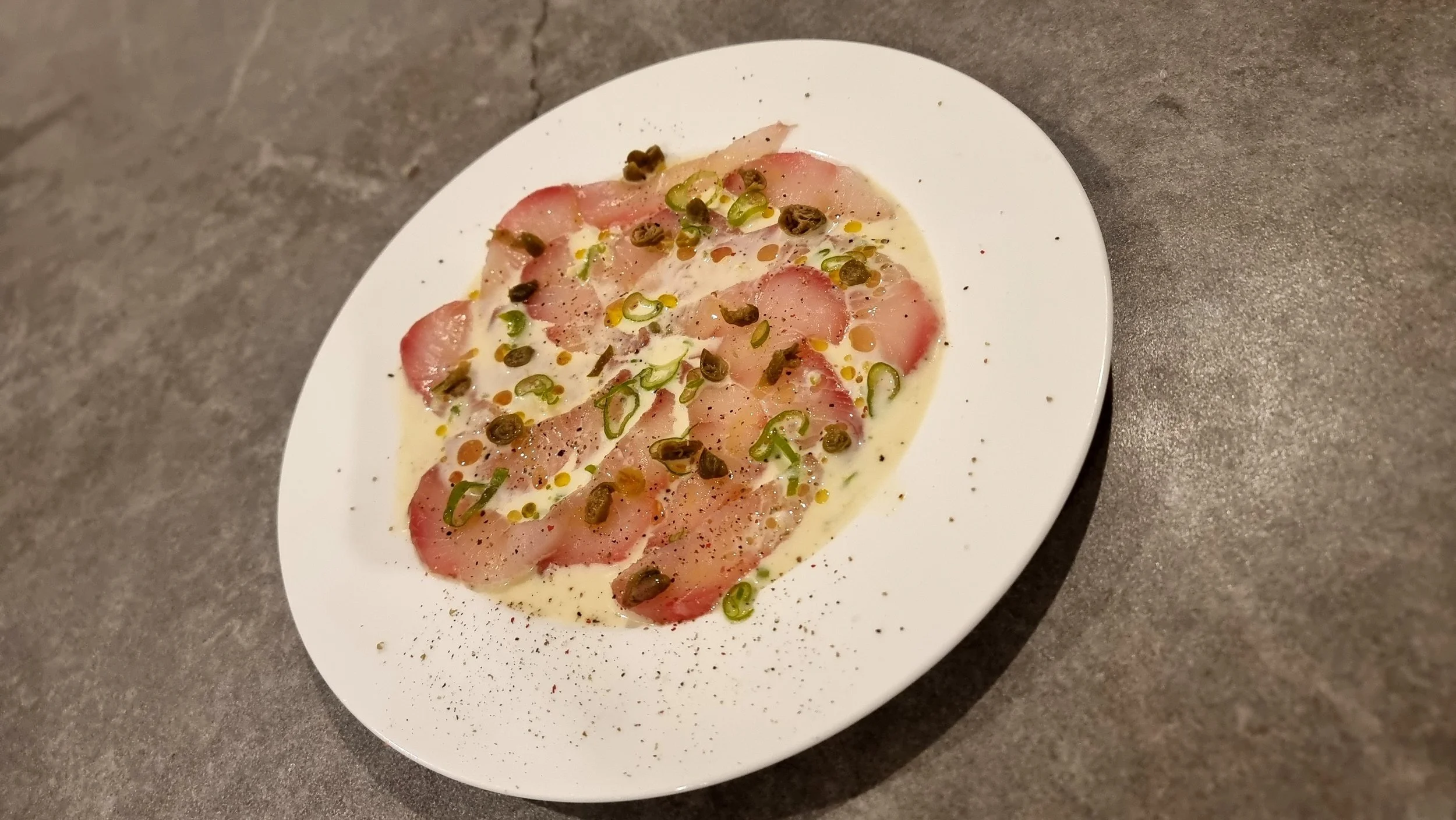 Fresh fish as a King Fish or Salmon cured in Lime with our special tiger milk.Albacore Tiradito: